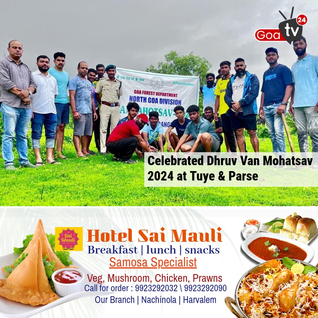 Celebrated Dhruv Van Mohatsav 2024 at Tuye & Parse by Dhruv Sports & Cultural Club along with Sarvajanik Ganeshotsav Mandal Parse in support of Forest Department Pedne in presence of social worker Saidas Naik, Nilesh Kalangutkar, Manoj Harmalkar, Sarvajanik Ganeshotsav mandal president Siddesh Naik, Gen. sec. Siddesh B. Naik, Suchetan Kalangutkar, Kannaya Padji, Abhishek Nagvekar, Gitesh Salgaonkar forest officer Snehal Salgaonkar & members of Dhruv & Ganesh mandal were present. Almost 150 saplings were planted.