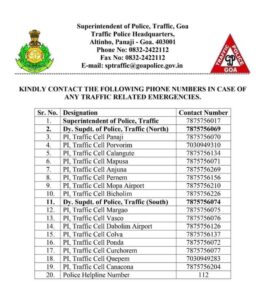 For any traffic related emergencies during the rainy season or to report rise in water levels on roads, public are requested to contact the local Traffic Police Inspectors for assistance or can dial 112 on Goa Police helpline.
