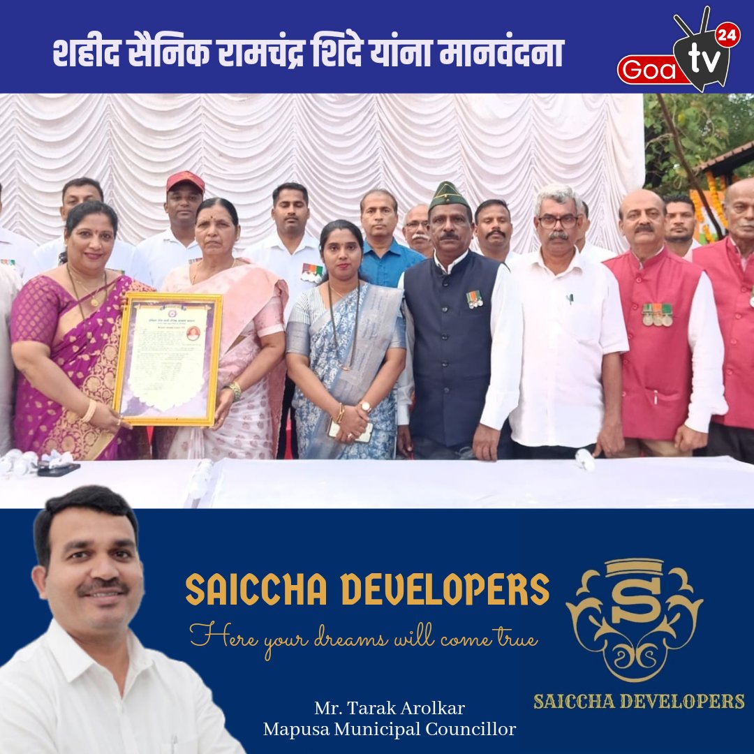 पार्से, वार्ताहर : अखिल गोवा माजी सैनिक वेल्फेअर असोसिएशन व म्हापसा नगरपालिका यांच्या संयुक्त विद्यमाने शहीद सैनिक रामचंद्र शिंदे यांच्या 18 व्या स्मृतिदिनानिमित्त त्यांना कुचेली वडेश्वर नगर येथे म्हापसा पालिका नगराध्यक्ष डॉक्टर नूतन बिचोलकर यांनी मानवंदना दिली.