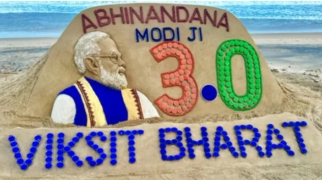 प्रसिद्ध वाळू कलाकार सुदर्शन पटनायक यांनी मोदी 3.0 चे अनोख्या पद्धतीने अभिनंदन केले, वाळूवर सुंदर कलाकृती कोरली.